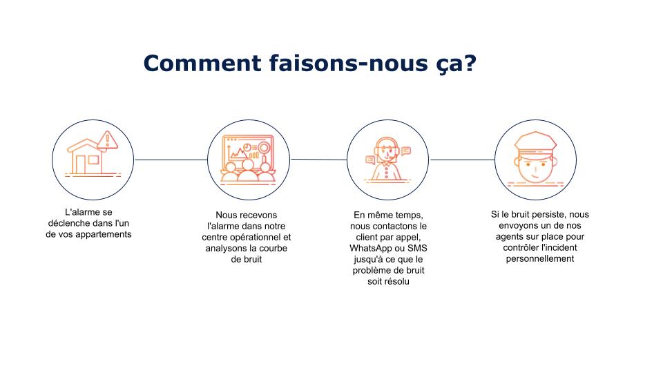 L’alarme se déclenche dans l’une de vos propriétés, notre équipe reçoit l’alarme dans notre centrale, analyse le graphique de bruit, contacte les invités par appel téléphonique et/ou WhatsApp, si le bruit persiste, nous envoyons un agent médiateur à la propriété pour vérifier et résoudre l’incident.